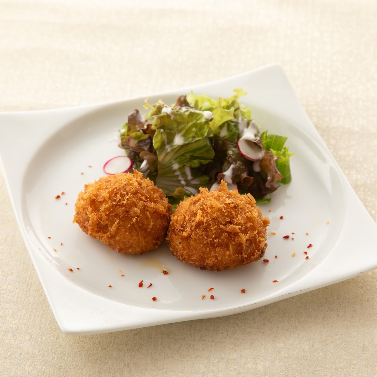 続いてご紹介するのは、「カニクリームコロッケ」です。外はサクッと、中はとろりとした食感が魅力のカニクリームコロッケになります。濃厚なクリームにカニの旨みをしっかりと閉じ込めました。ビールやワインのお供にいかがでしょうか。ぜひお召し上がりください。