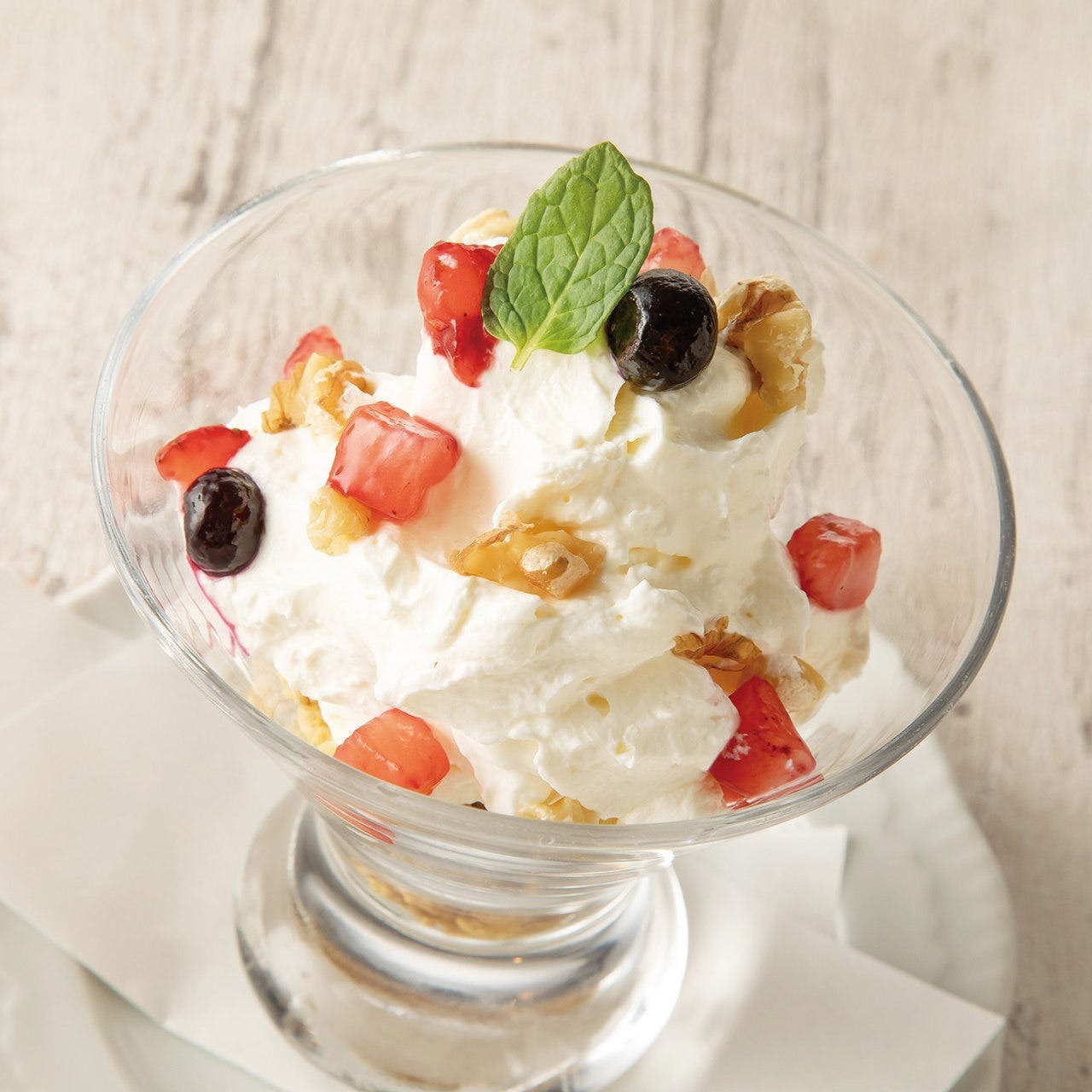 チーズフォンデュを堪能した後は、デザートにもチーズを使った一品はいかがでしょうか。こちらは「ベリーのふわっとレアチーズ」になります。なめらかな口当たりのレアチーズケーキは、ほどよい酸味とやさしい甘味で、ひと口お召し上がりいただくと、もうひと口と後を引く方は少なくないはず。ぜひご賞味ください。