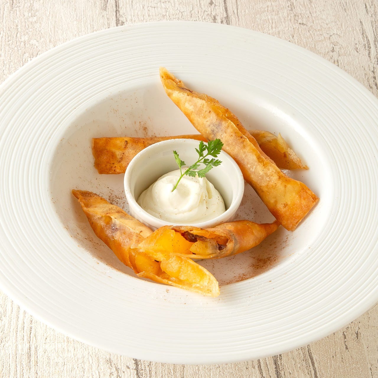 食事の締めくくりには、甘いデザートはいかがでしょうか。上記は一部になりますが、コーヒーのほろ苦さとクリームのコクが絶妙にマッチした大人のデザート「ティラミス」と、りんごの甘味とサクサク食感が楽しめる「アップルパイ ~スプリングロール仕立て~」です。ぜひお召し上がりください。